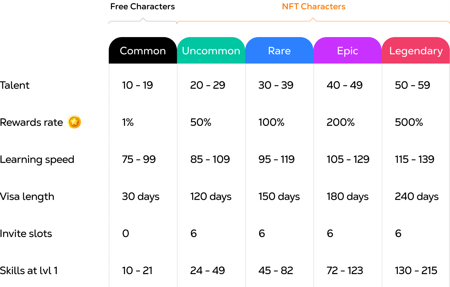 Rewards rate: Characters of different Rarities get different amounts of rewards (LSTAR) for the same learning actions. We created it this way to keep people with different income levels motivated, in the same way we kept the entry price for NFT Characters below $100.
