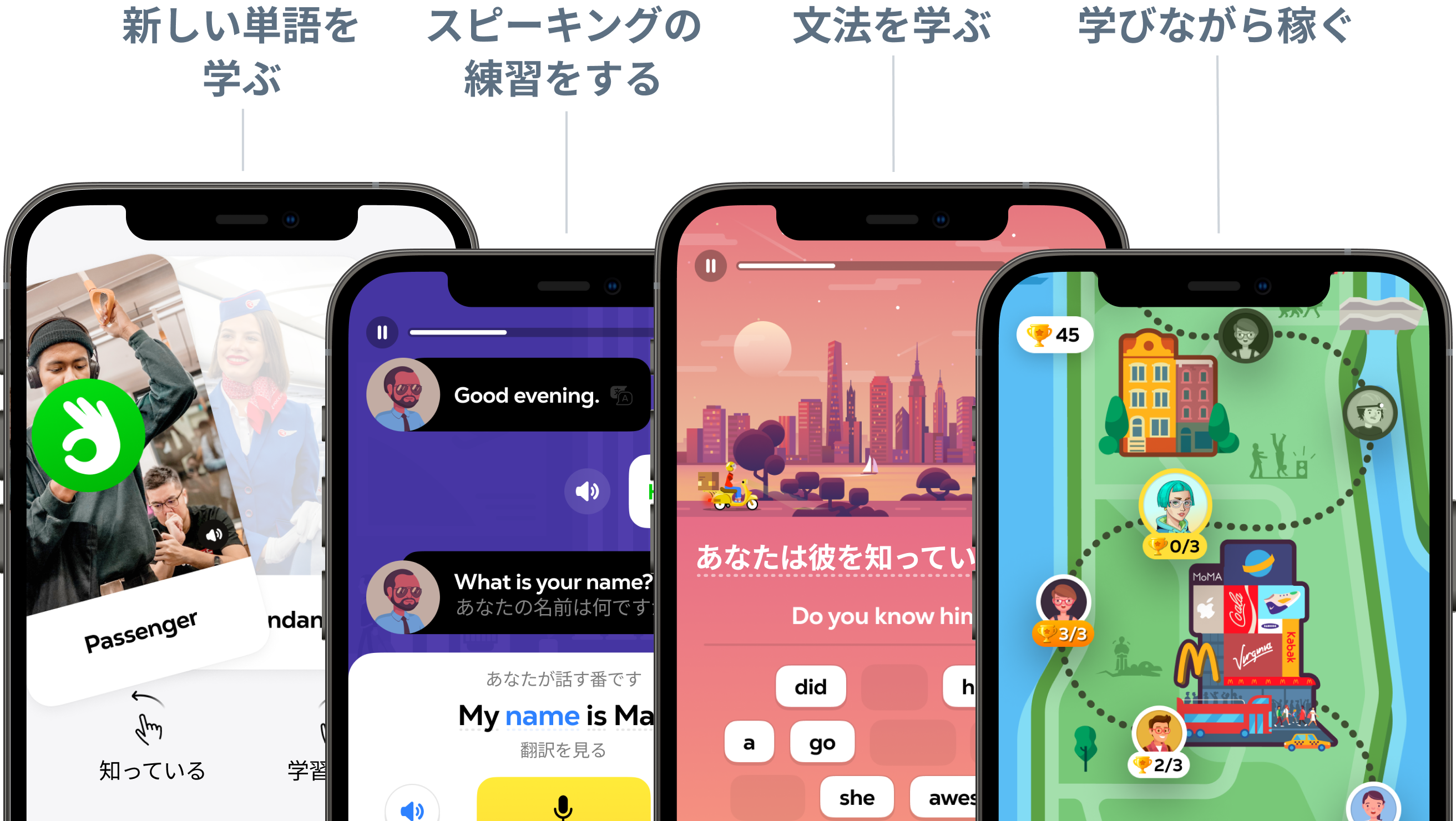 現時点での学習体験の内容はどういったものか紐解いてみましょう。 App Store において、200 万回以上ダウンロードされ、4.8 **⭐** 評価を得ているモバイルアプリであり、アプリ内では、ニューヨークを舞台とした没入型の楽しい仮想設定の中で、現実的なシチュエーションを通して以下のアクティビティを行います。